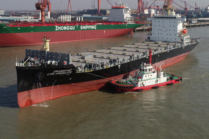 揚(yáng)子長(zhǎng)博為致遠(yuǎn)航運(yùn)建造的1800TEU集裝箱船“TRANSFAR LOS ANGELES”輪交付離廠